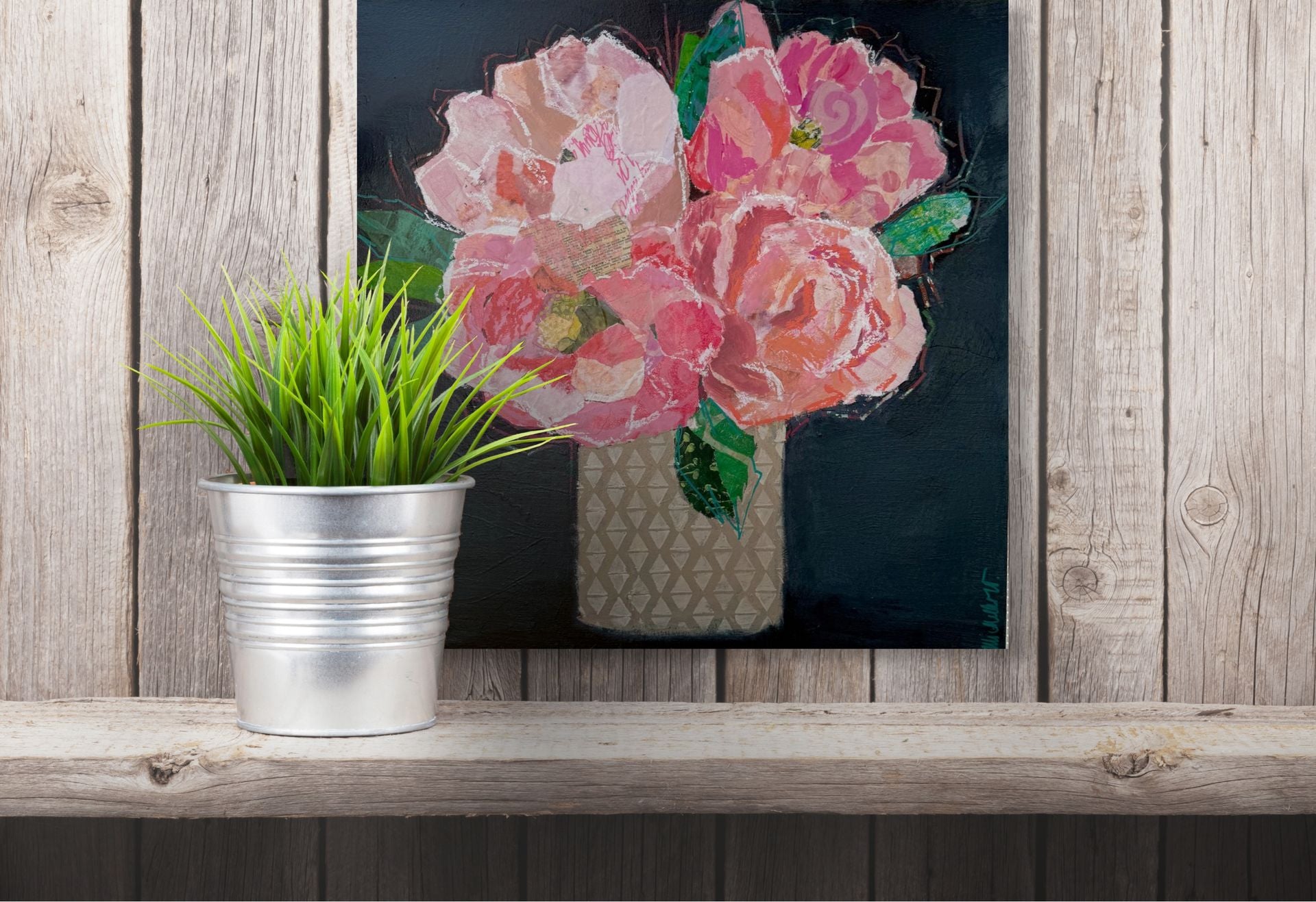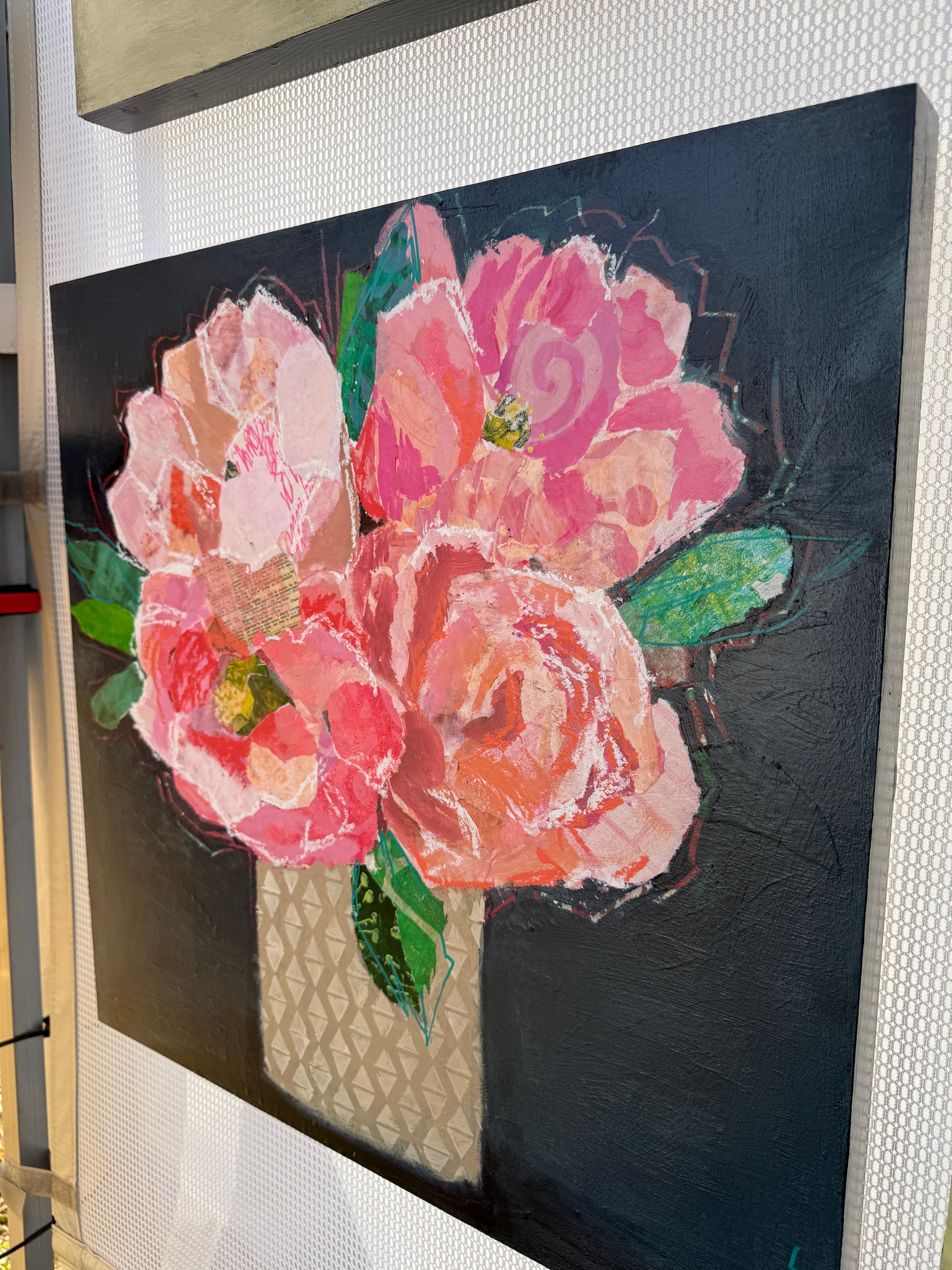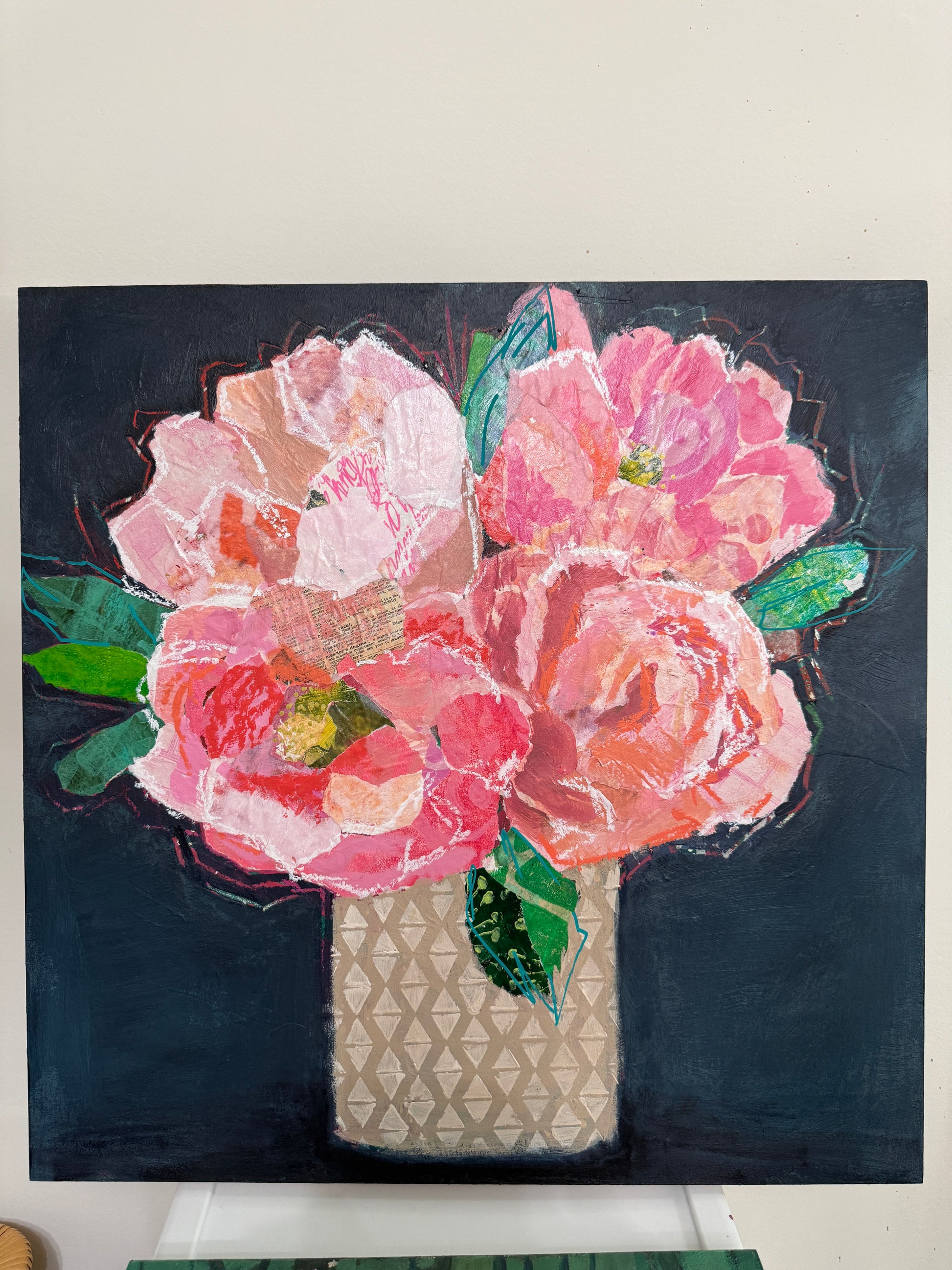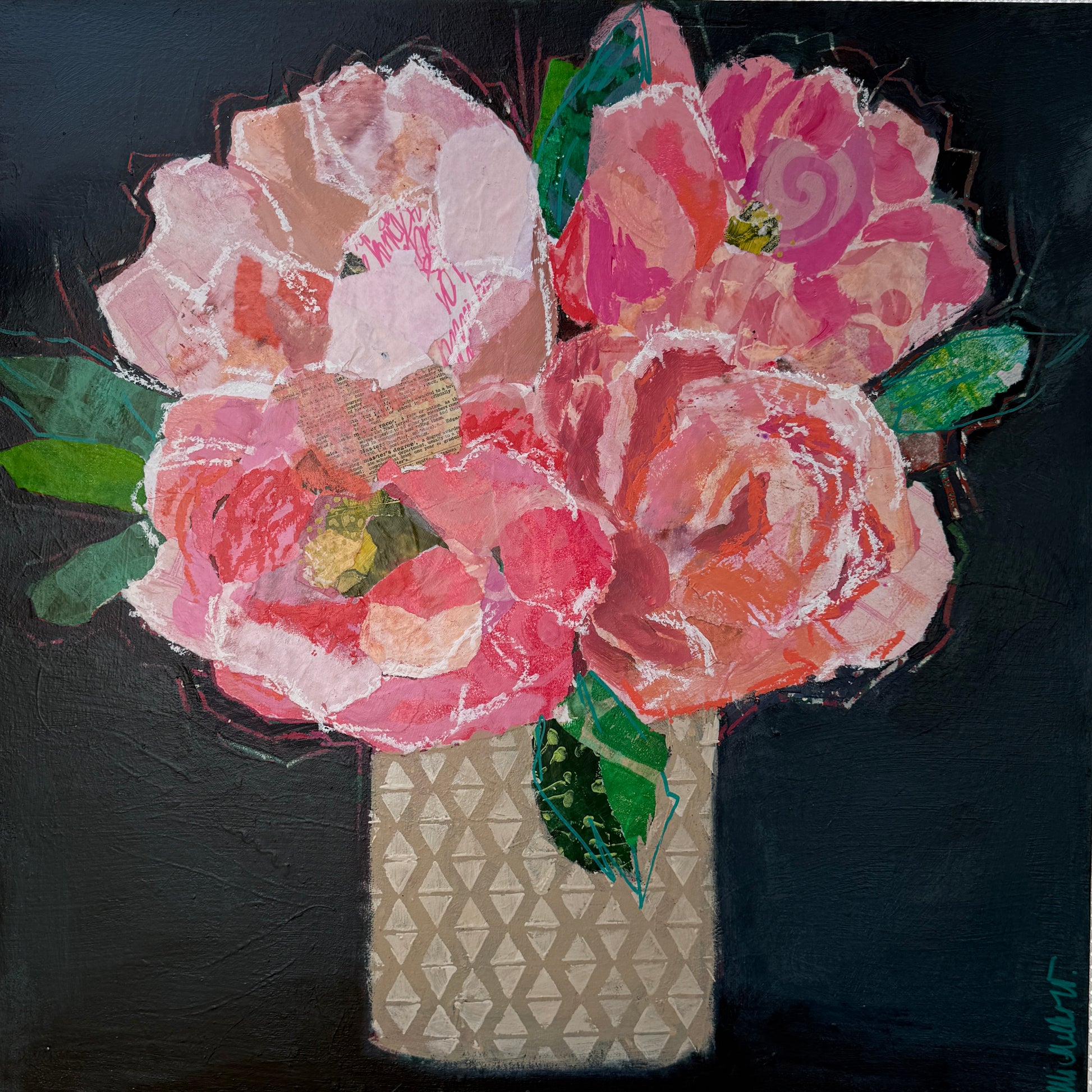 A vibrant bouquet of peonies blooms in rich pinks, corals, and layered collage textures. This 20” original piece brings warmth, movement, and joy to any room.