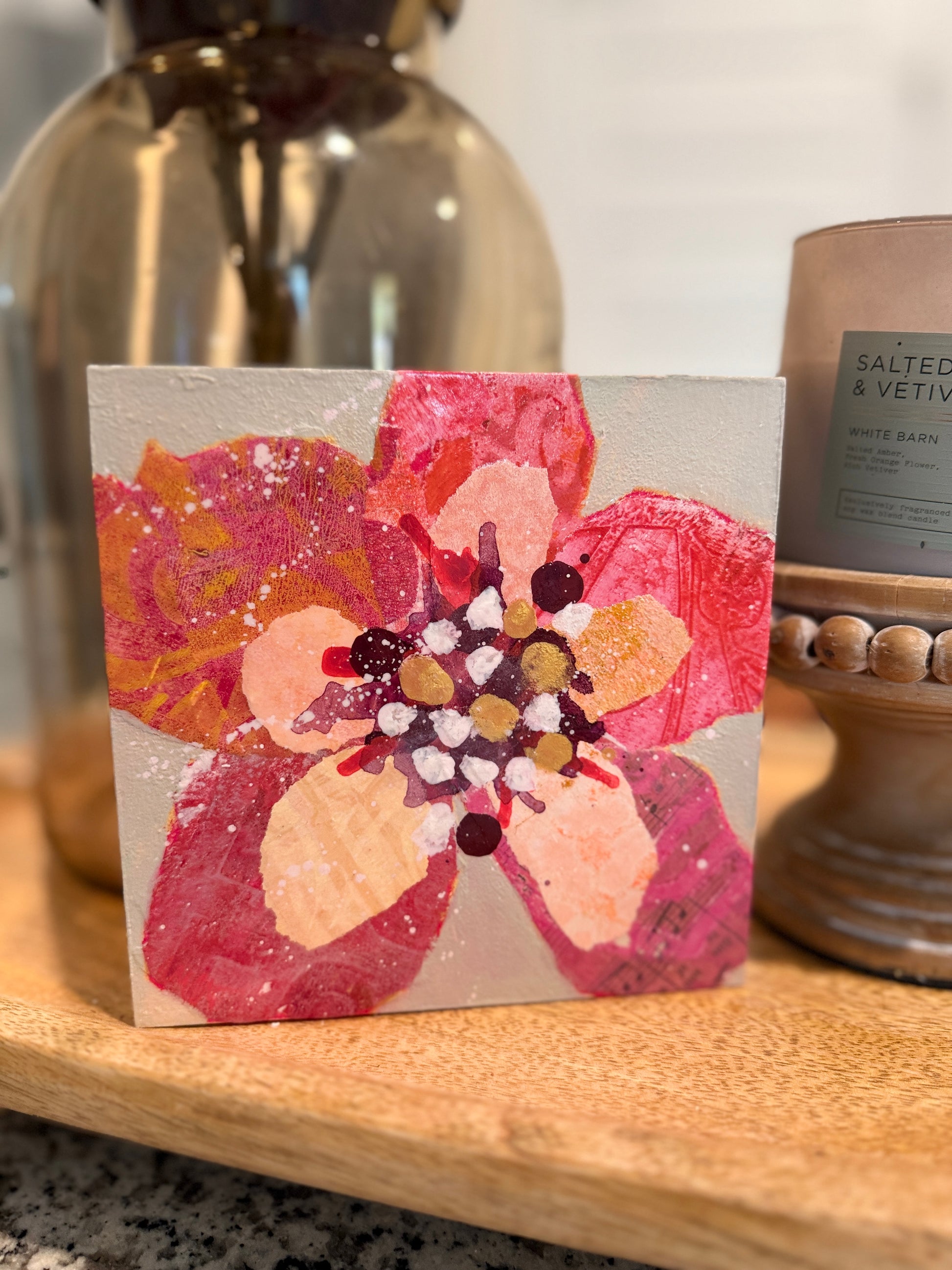 Brighten up your space with this bold and beautiful Blooming Bright Mini Art Block Collection. These original mixed-media flower artworks are created on sturdy wood blocks, each measuring 6x6 inches. Featuring rich textures, vibrant color, and playful splatters, these art pieces are sure to make a joyful impact wherever they are placed.
