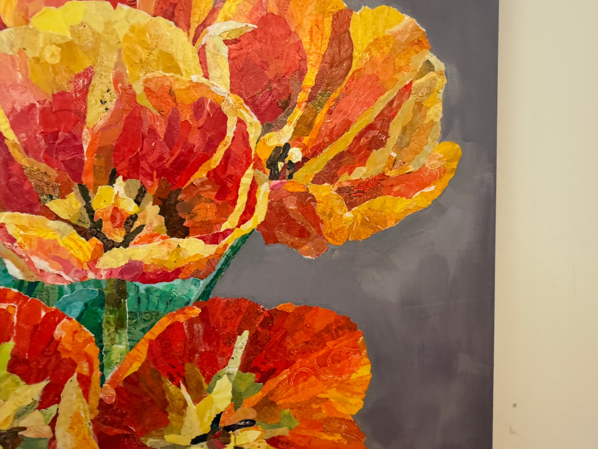 Keywords: large floral painting, bright contemporary art, modern flower wall art, colourful mixed media canvas, bold home décor, orange red tulip artwork, vibrant statement painting