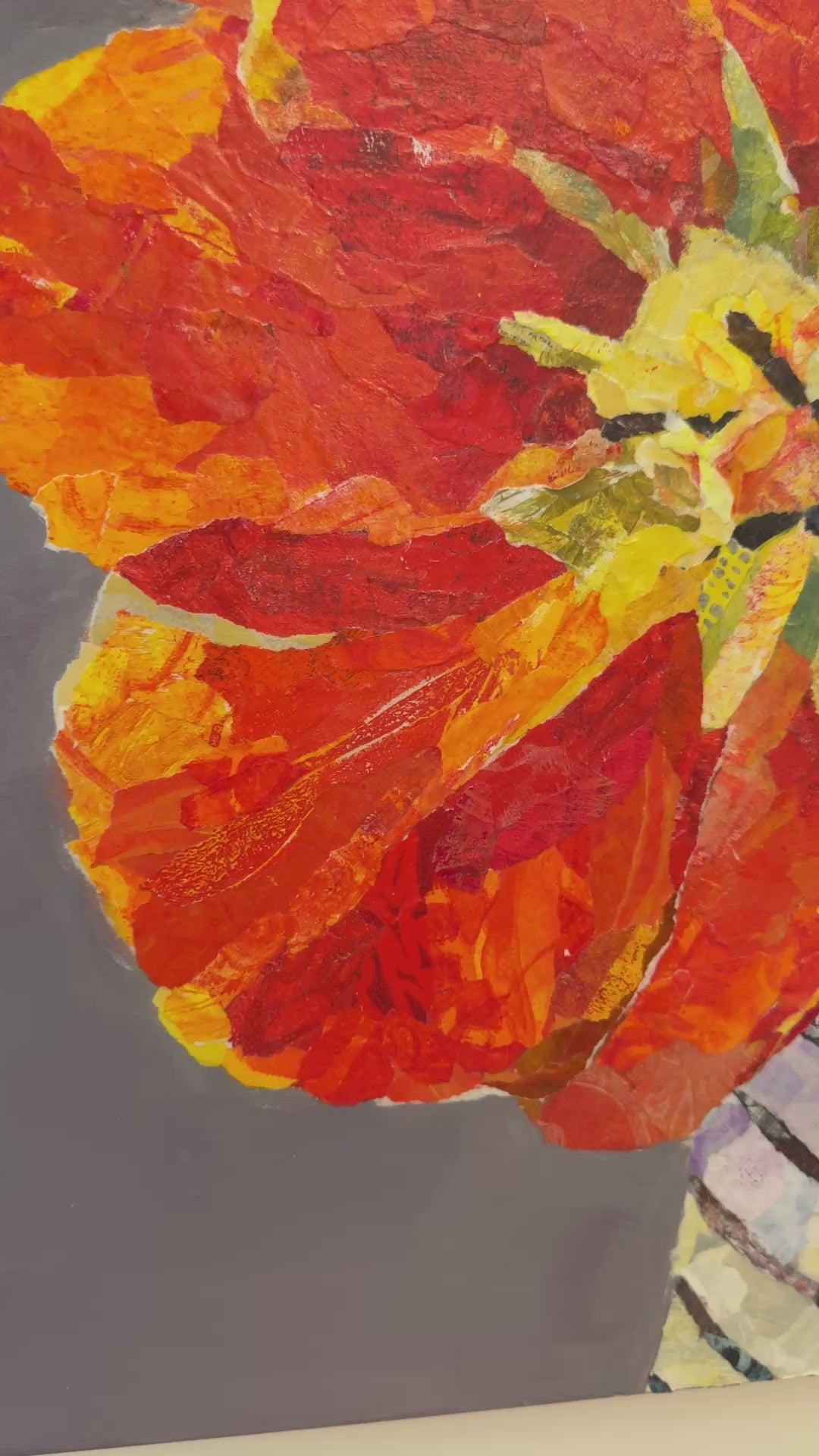Petal to the Metal captures the bold, joyful energy of flowers at their brightest. Painted in rich layers of orange, red, and gold against a soft grey background, this large mixed media artwork radiates warmth and optimism. The striped vase adds a playful graphic rhythm, grounding the composition while keeping it light and modern.