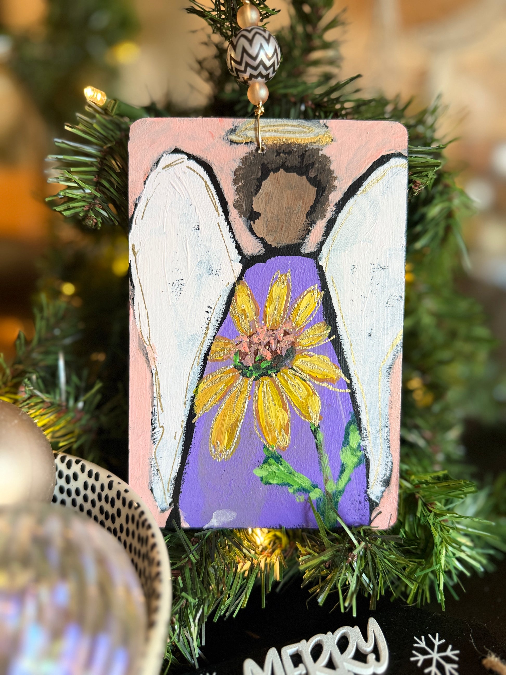 Each angel begins as a small wood panel, layered with acrylic paint, collage textures, expressive mark-making, and fine details—all done by hand in my Georgia studio. Flowing wings frame a soft floral heart and warm, joyful colors that glow beautifully on the tree or as a year-round decorative accent.