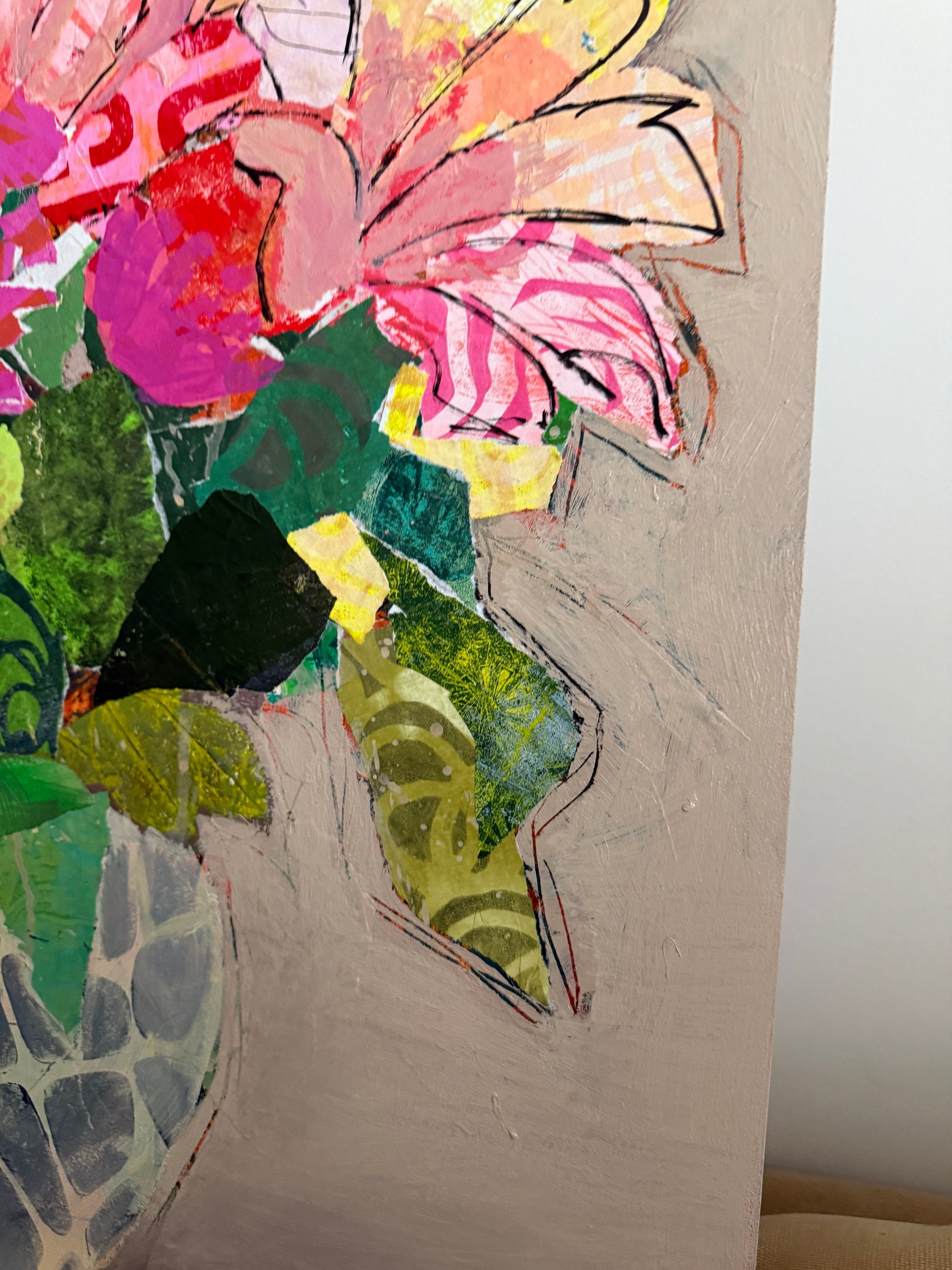 The soft taupe background allows the vibrant pinks, greens, and yellows to truly sing, while the patterned vase adds a modern, playful touch. Perfect for collectors who love florals with personality, texture, and a sense of story.